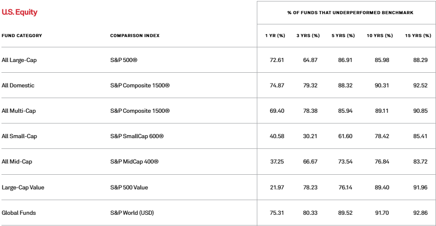 The S&P Dow Jones SPIVA (S&P Indices Versus Active) report tracks how professional fund managers perform against passive index benchmarks. The short-term results appear encouraging—30-75% of professional managers beat their benchmarks over one-year periods in U.S. equity categories.