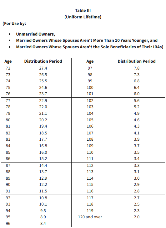 - Uniform Lifetime Table (used by ~90% of individuals)